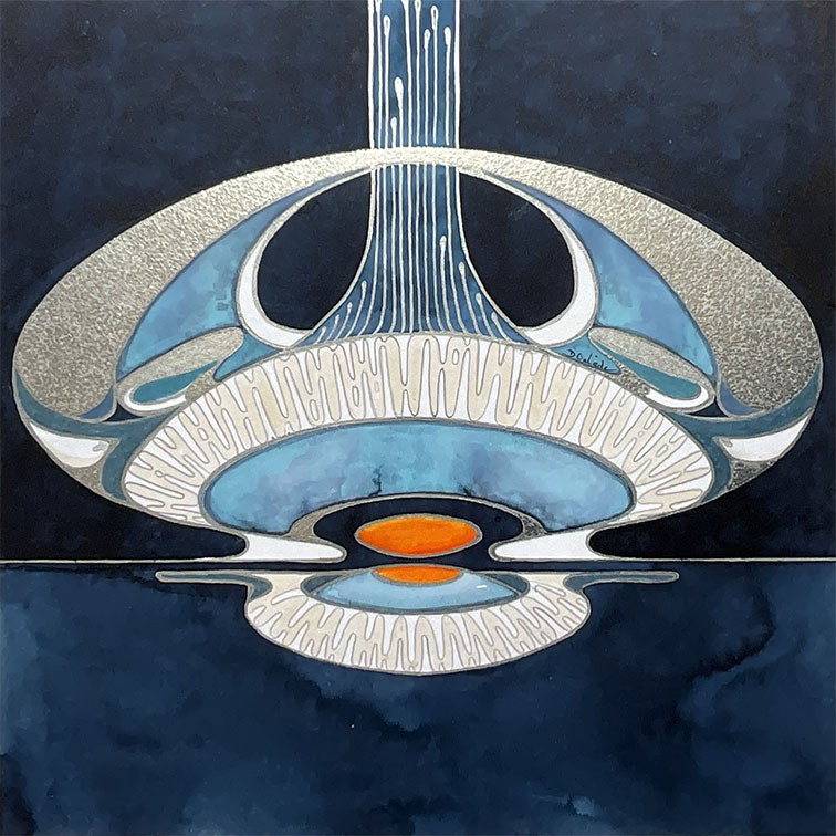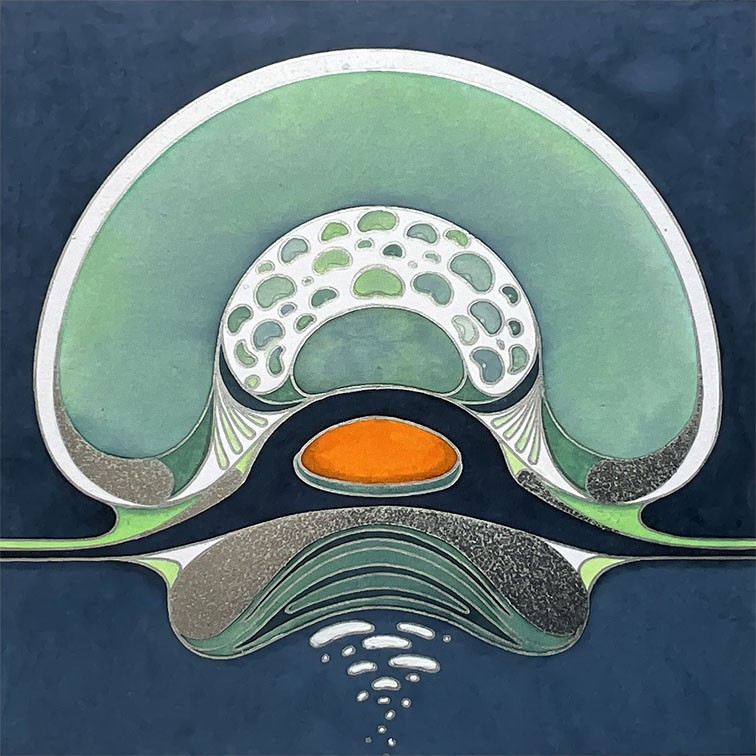David Balade s’inspire de cette visionoriginelle et des figures de Chladni, représentations graphiques des ondes vibratoires, pour créer des compositions où les lignes ondulantes et les formes translucides suggèrent des mouvements aquatiques et des vibrations invisibles. Aquarelle, encre et pastel donnent vie à un univers en perpétuelle métamorphose, où lumière, fluidité et rythme se mêlent.